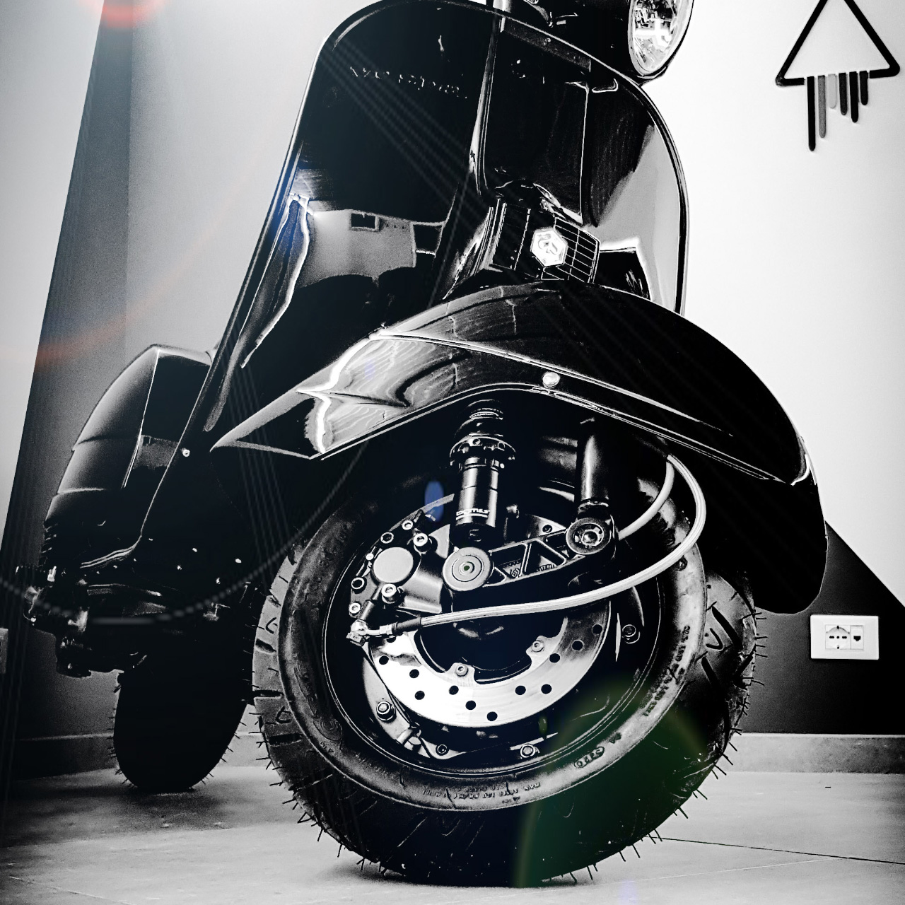 Vespa PX black custom superlow 150cc. Forcella accorciata di 50 mm rispetto alla forcella PX standard, ammortizzatore PK BGM Pro SC SPORT regolabile in altezza e in continuo 195mm + 205mm.